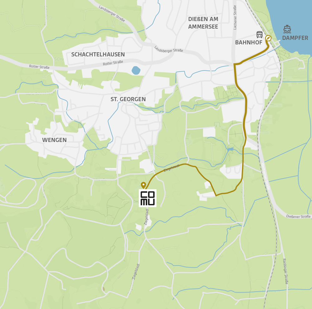 Von der Schiffsanlegestelle Dießen sind es zu Fuß ca. 40 Minuten bis zum Ziegelstadel.
